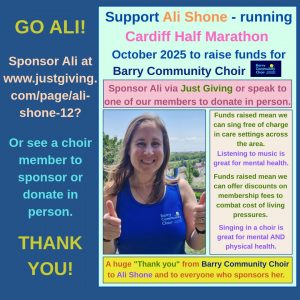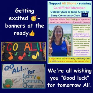 Big day tomorrow! Big shout out to Ali Shone running Cardiff Half Marathon to raise funds for Barry Community Choir. Thank you Ali, and Good luck. We really are all so grateful for you undertaking this huge task for us. We’ll be cheering you on all the way. Go Ali!#cardiffhalfmarathon#communitychoir#keepsinging