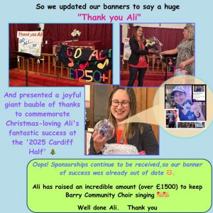 Last Wednesday we welcomed our hero to rehearsal to say a heartfelt “Thank you” to our wonderful conductor Ali, who bravely battled injury to run the 2025 Cardiff Half Marathon to raise a phenomenal amount to keep Barry Community Choir very much alive and singing . Not only did Ali complete the half marathon, but she did it in a fantastic time and in great spirits, crossing the finish line like a gazelle at speed. The next few days might have been taken at a more gentle pace to aid recovery. Well done Ali and “Thank you so much” #communitychoir#VibrantCommunity#keepsinging