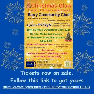 Barry Community Choir has been quietly evolving, refreshing and reinvigorating itself over recent years, especially after the ravages of COVID and measures which prevented any singing. The choir has very successfully risen up again and with fresh music to sing in a balanced mix of styles, with membership steadily increasing, and our sound being developed by professional coaching and support, our confidence has built and the results are just joyful, and will appeal to many audiences. A professional opera singer recently remarked “BCC has the best sound I have heard from a community choir”.
