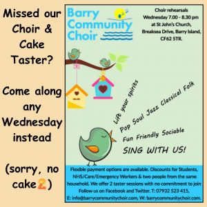 Did you miss it? We had a fantastic evening with great singing, very positive vibes, and absolutely mouth-watering tasty cakes made by our own members. Thank you to Ali, Amy and all the bakers. We had 5 people looking to join – a great result. If you missed our Choir & Cake Taster evening, don’t worry – you can come along to a rehearsal on a Wednesday evening at St John Church, Barry Island 7-8.30pm. You’ll always be welcome. And if you come along on the first Wednesday of any month, there’s usually tea & biscuits, a raffle and time to chat afterwards