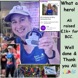 Ali is running the Cardiff Half Marathon on October 5th to raise funds for Barry Community Choir. At BCC we believe that good music should be available to everyone. So the money raised from this will be used to benefit singers and audiences alike in Cardiff and The Vale of Glamorgan. Choir funds help to keep membership subscriptions reasonable and allow us to offer a variety of discounts, help us buy music copies which we lend to members, help pay for professional music leadership so that we perform well, and help cover our costs of performing at venues and events which are either unable to pay themselves, or which raise money or awareness of other charities in our area.
